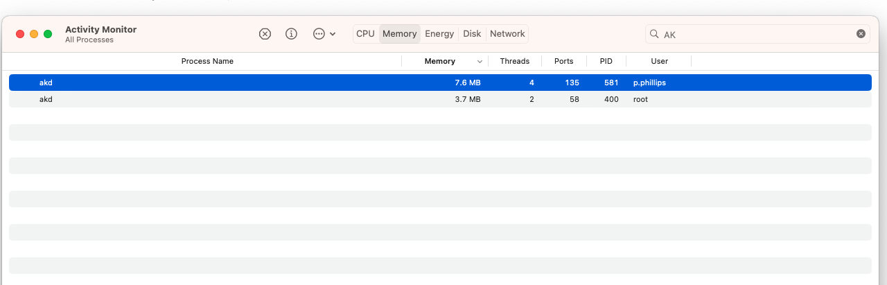 Is see an " akd " processes twice in Activity Monitor >> View >> View All Processes