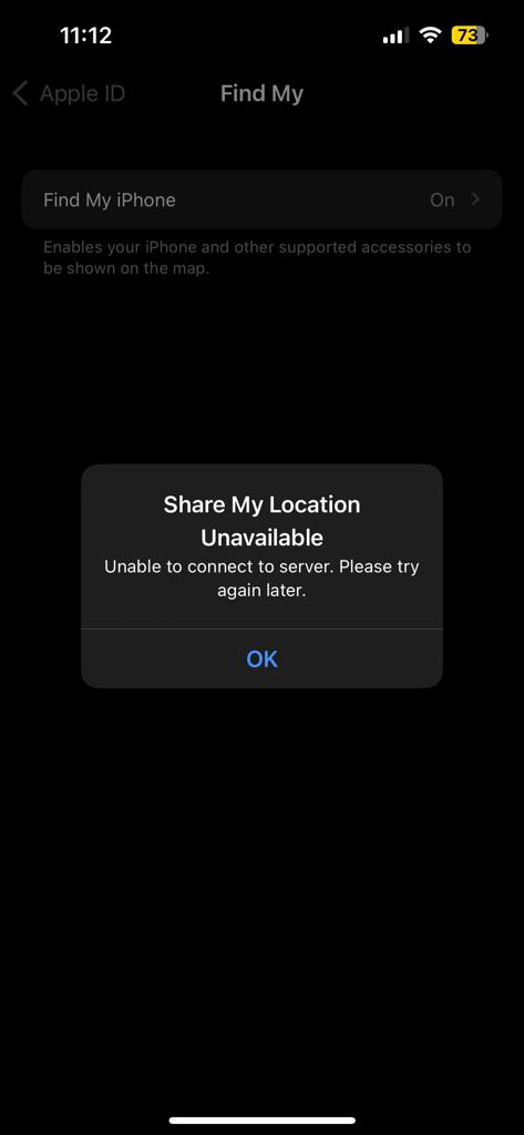 "iPhone findable after turn off" This message suddenly disappeared, and when I go to enable it getting this error "share my location unavailable" "Unable to connect to server"