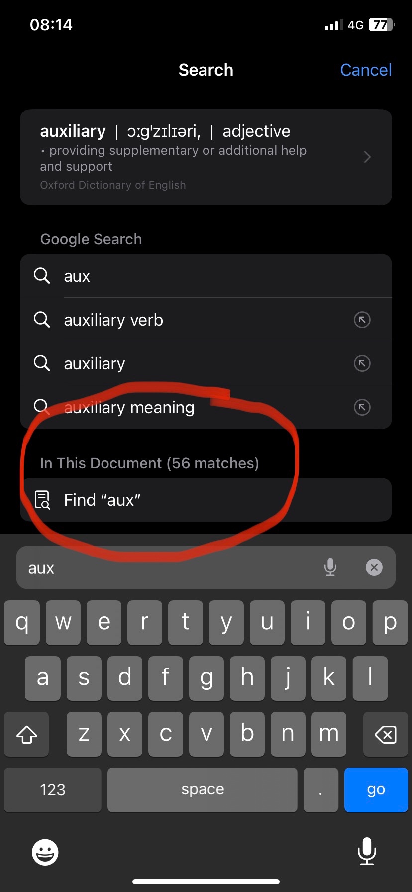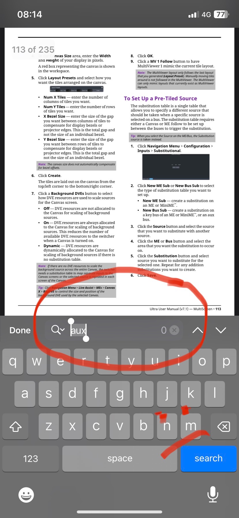 See photos….(I’m searching a pdf document for the keyword ‘aux’ in these pics)