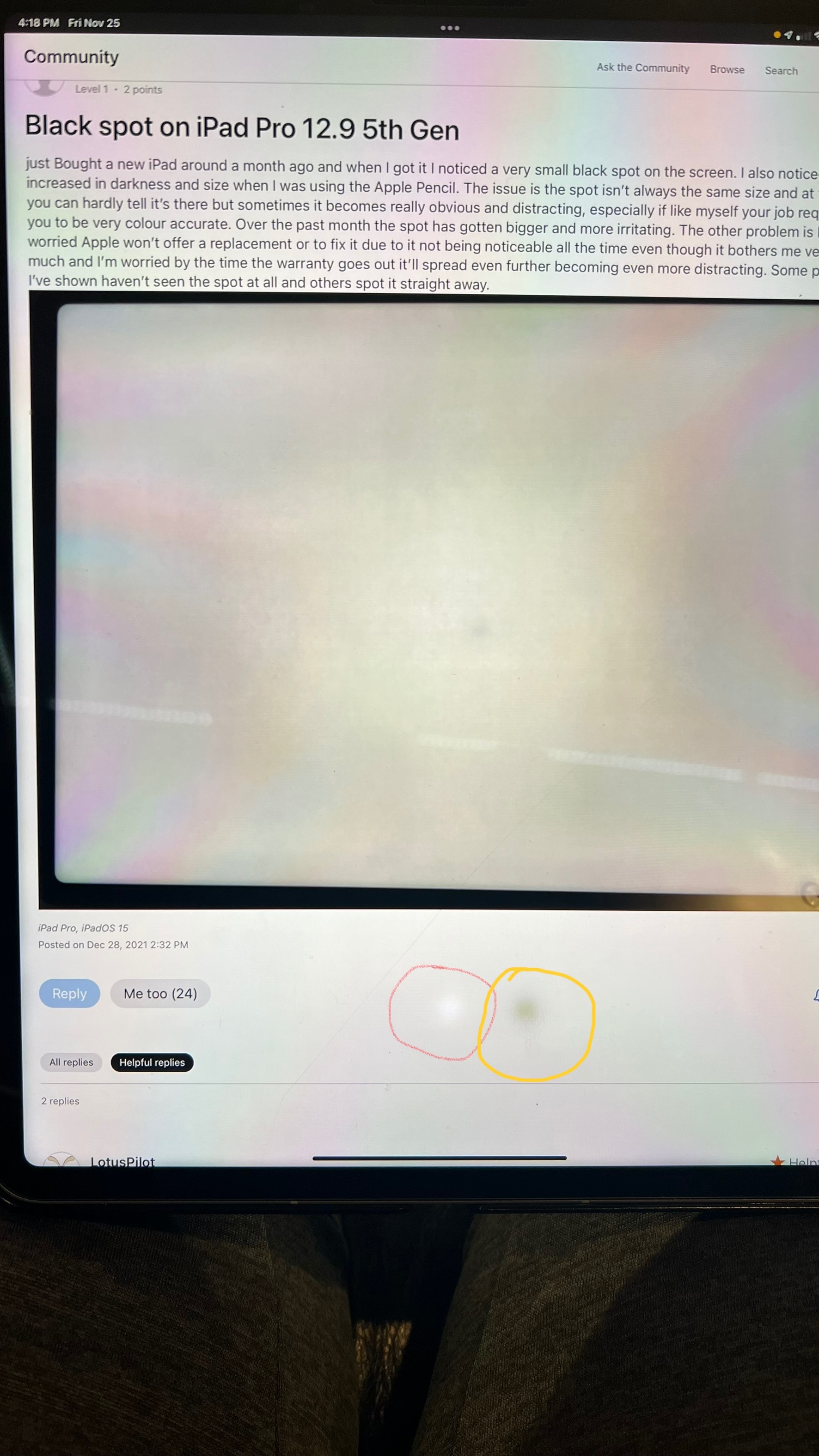 I have a dark spot and a light spot in my iPad Pro 12.9 screen. Here is a phot of your pic on my iPad with my spots circled. Has anyone found out what this is before I take it to the apple store?