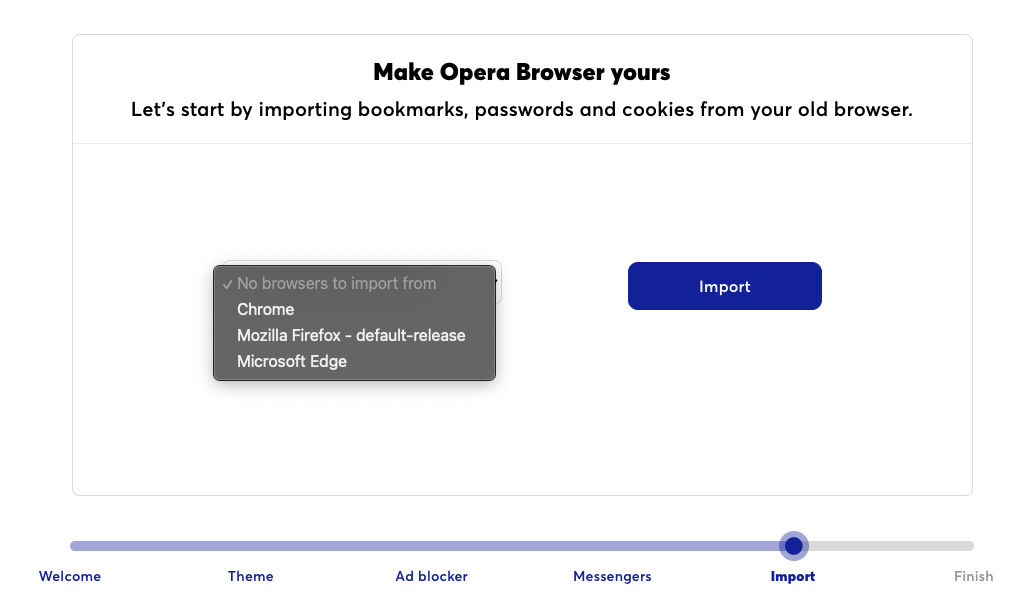 In the past, the computer screen would occasionally ask me if I wanted to move Bookmarks to the browser I happened to be using. I would say, yes, and with a click or two, the job was done. This time, I'm not being asked, but I do want to transfer all of the Bookmarks in all of the browsers I used, including Opera, to my new computer. Remember, I want to transfer all of those Bookmarks from my old iMac to the Opera browser in my new iMac. How do I do it?