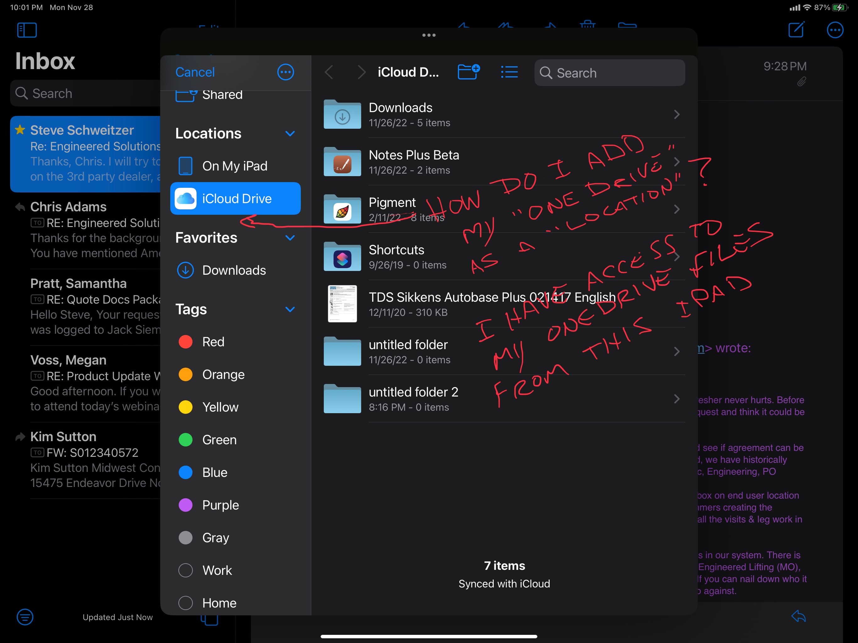 I can’t seem to get access to my OneDrive account while writing an email in “MAIL”. OneDrive is no longer a ”location” for files access. This is a new development since transferring everything from my old iPad to a new one.