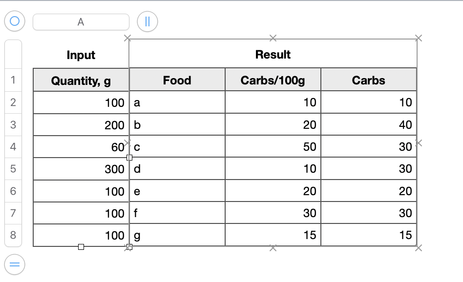 • A Result table(locked) with fixed data (Food, Carbs/100 g) and the result (formula to calculate Carbs).