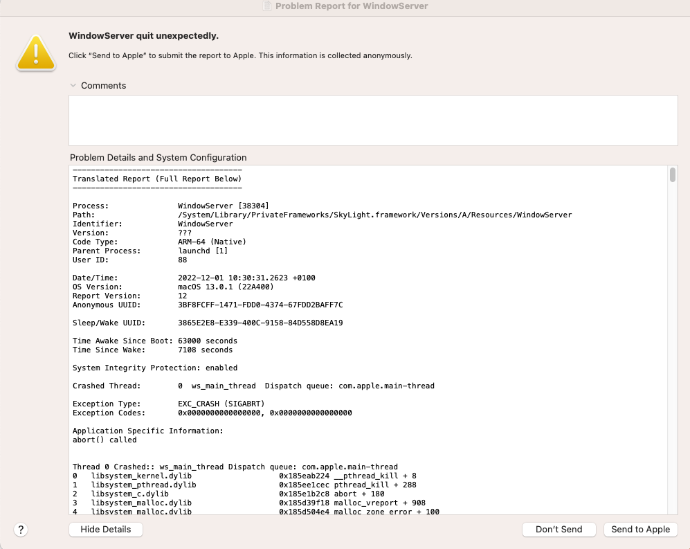 MacBook Air M2 - WindowServer quit unexpectedly.