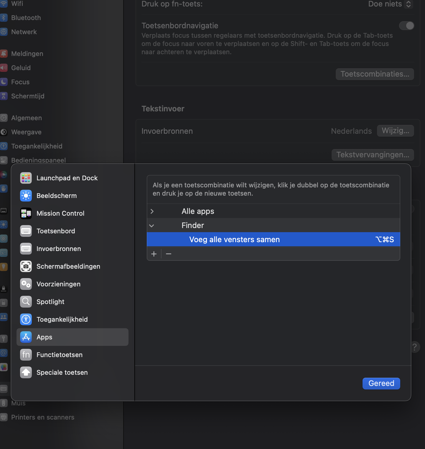 I'm a bit lost on how to add a shortcut in the keyboard settings. I always add a shortcut to 'combine all windows into one' (or something similar in English). I use it a lot to clean the view. But I can not find it in Ventura. Hope someone can help me to give an instruction. thank you!