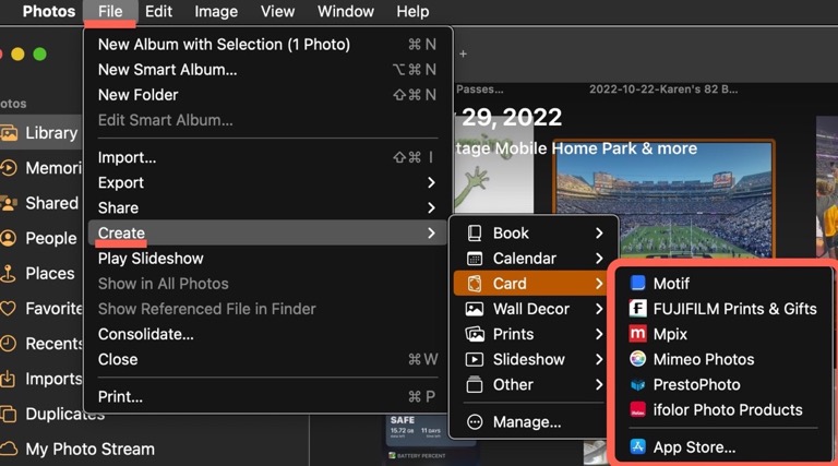 It depends on what you're using to create the card. If it is one of the integrated apps that work within Photos you just select it and use the File ➙ Create ➙ Card menu option: