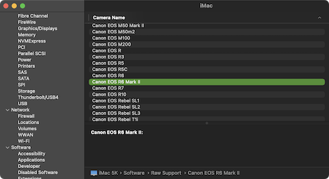 Monterey supports the R6 but not the R6 II model, and Apple does not provide retroactive camera RAW support. As it turns out, at this early date, Ventura does not explicitly show support for the R6 II camera either, but it may in the next several months depending on when Canon updates Apple with the specific camera data.