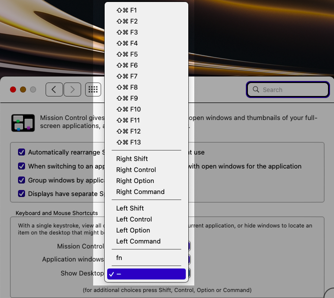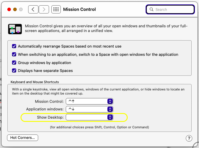 Preference > Mission Control > "K...Shortcuts" > "Show Desktop" field | Regardless of user choice, the field value resets to blank after restart.