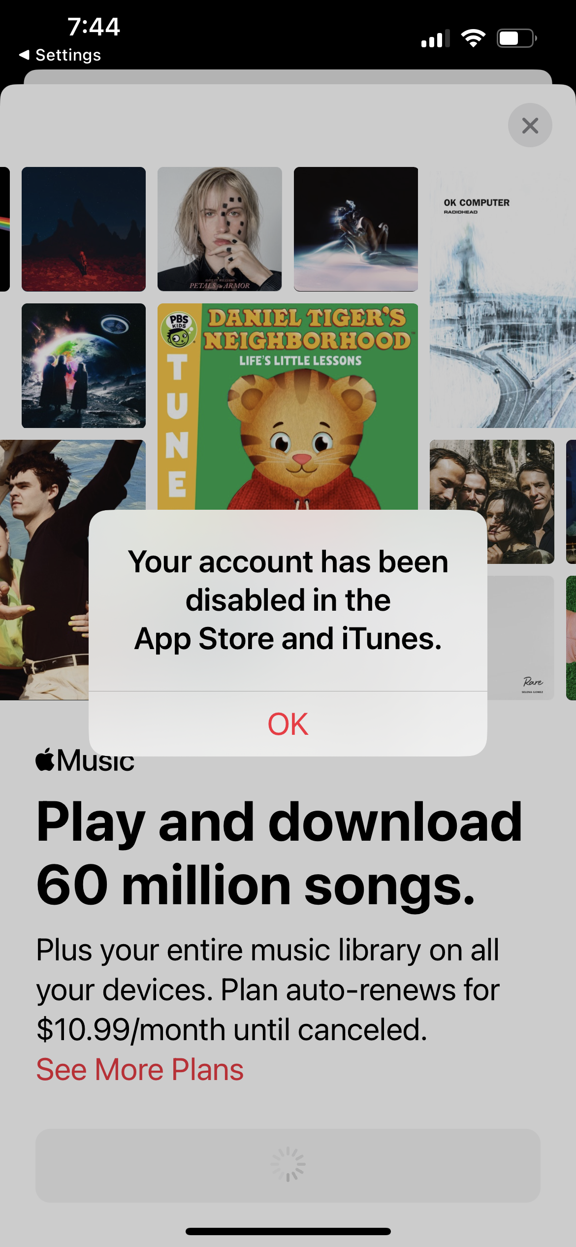 My Apple Music has been disabled in the app and iTunes Store. How do I get this corrected? I have a family share plan and theirs is working