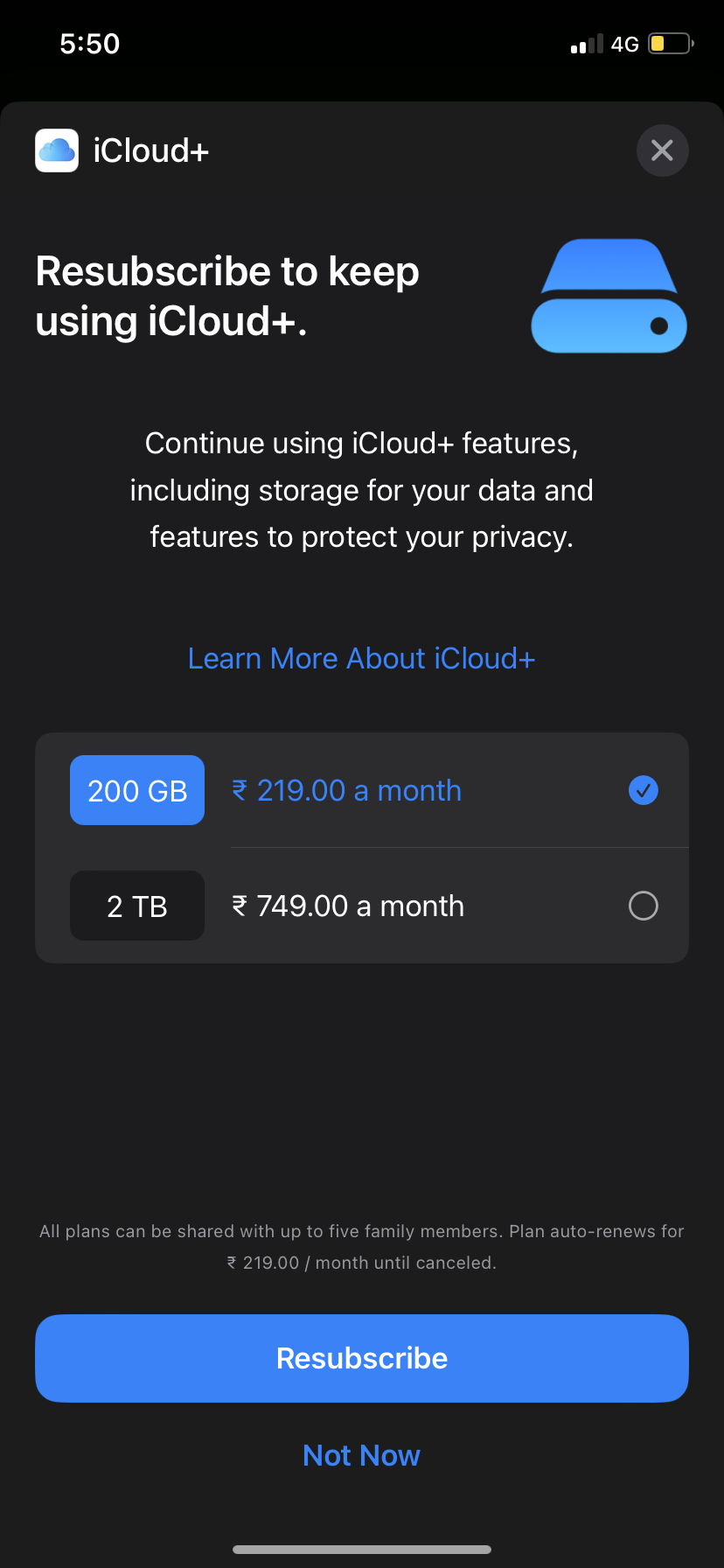 I am not getting the option to upgrade my iCloud storage to 50g ans it only shows me 200gb plan
