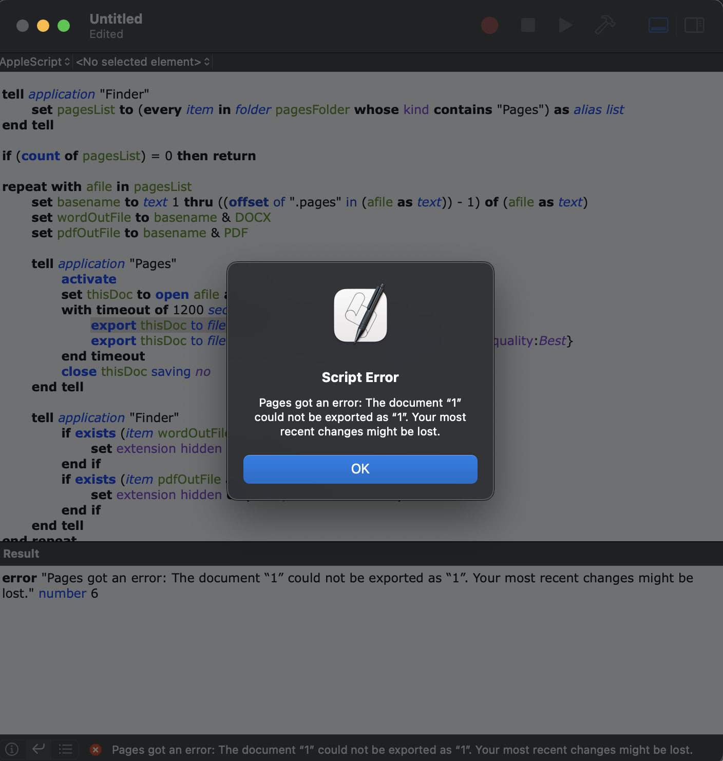 It will prompt your for the parent folder that contains your subfolders and Pages document hierarchy. It works on an list of your Pages documents, determines for a given document location if a "Word" folder exists and makes one if missing. It then requests that Pages export that Pages document to .docx with that respective Word folder as the export target. When done, a completion dialog will appear showing how many Pages documents were processed and a count of Word documents exported.