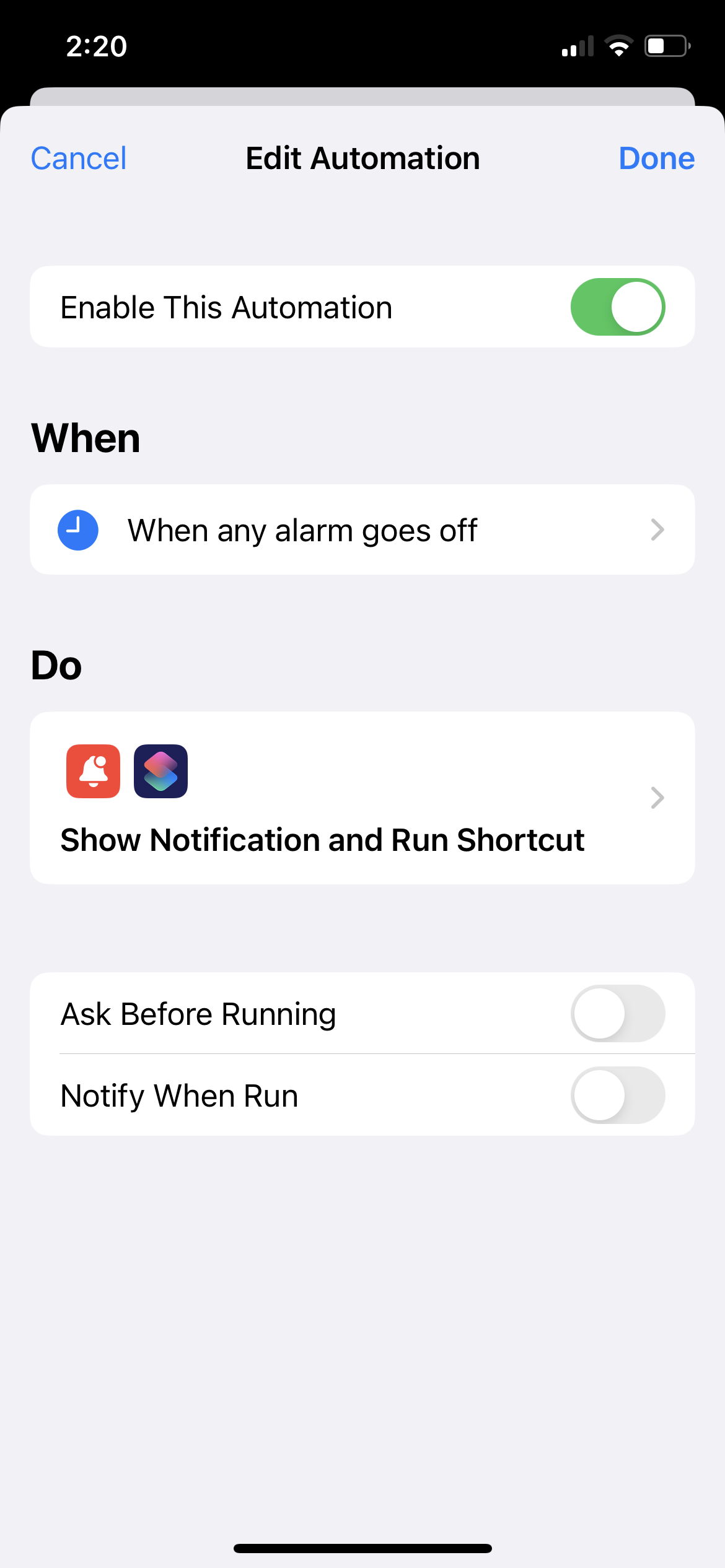 I’ve obviously turned off the “ask before running” switch. I even tried disabling my passcode completely but it still asks me for permission to run when my alarm goes off! I tried adding an action to “go to home screen” first when the automation starts. It still creates a notification asking if I want to go to the home screen. There is no action to “unlock Home Screen”.