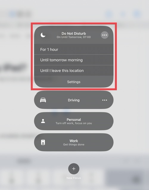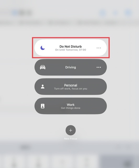 To temporarily deactivate an active focus, open the Control Centre, then touch-and-hold (i.e., long-touch) the active Focus Button: