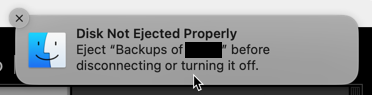 I've got Time Machine on a MacBook Pro configured to backup to an iMac with a network Time Machine-shared external drive. This has worked fine for several years, but since upgrading the MacBook Pro to Ventura, each morning I'm greeted with one or more alerts: "Disk Not Ejected Properly: Eject "Backups of <MBP name>" before disconnecting or turning it off.