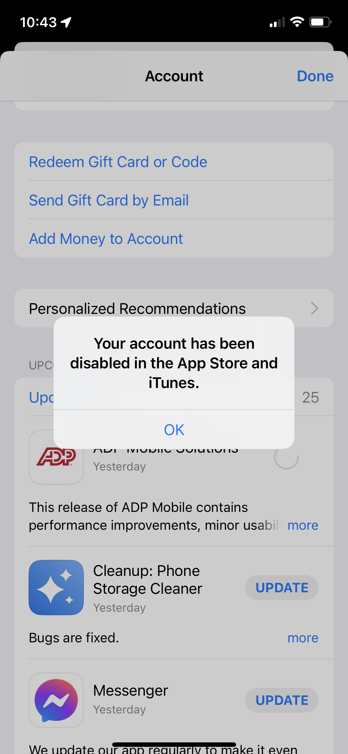 If you see a message that says 'Your account has been disabled in the App Store and iTunes' - Apple Support.   *