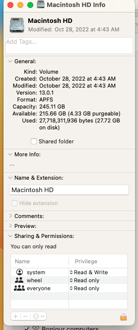 Hi-I am running Ventura on my 2020 M1 MBP. When I highlight my hard drive and go to the bottom I noticed that in Sharing & Permissions I can't change the "wheel" & "everyone" to Read & Write. Is that the way it's supposed to be? I unlock the lock and put in my password but I get the message that I can't do that... See screenshot. Thank you for your help! Merry Christmas!