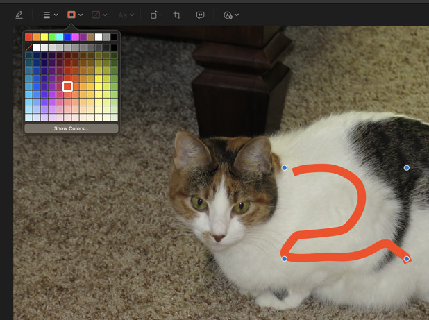Trying to draw on a photo using Mark Up in Photos on my MacBook Pro (OS 13.0.1). When I click on the Draw symbol (2nd from left) & then try to draw a circle using my trackpad, nothing happens. I release & get 4 blue dots in the shape of a square. No idea what's up with that, no matter what I try, I can't draw a plain black circle around an object in my picture.