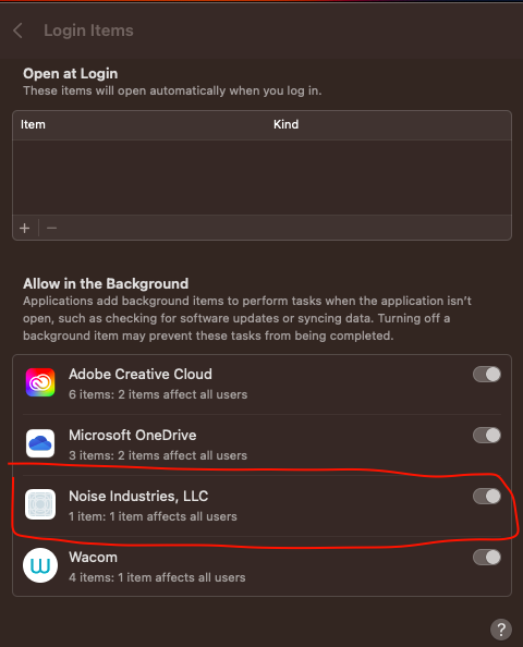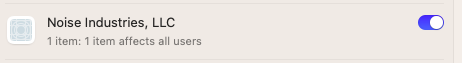 I haven't seen anything like "noise industries", app or anything in my mac. I recently updated in ventuera , and seems like my mac got slow, then , slowly checking the system function, checking the system system I noticed login items with noise industries,