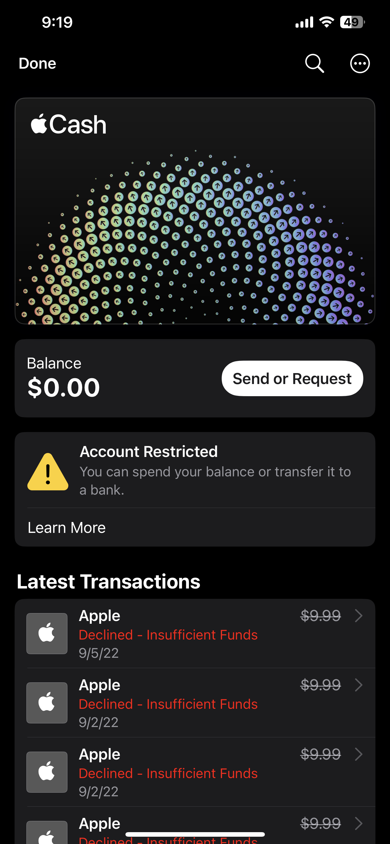 Your account may be restricted if your identity verification fails multiple times, if there are multiple accounts tied to the same social security number, or if there's suspected fraud on the account. If your account is restricted, you can still transfer your Apple Cash balance to your bank or use it to make purchases with Apple Pay. You can't send or receive money, or add money to your account.