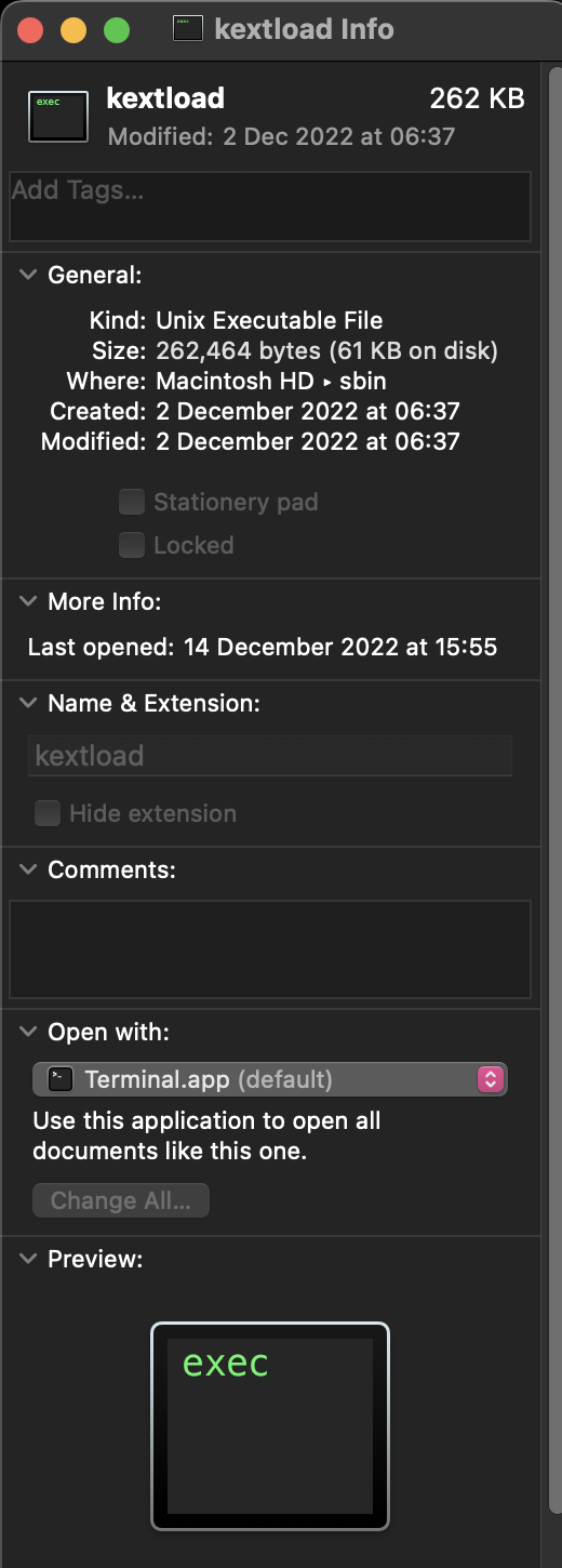 Apple also prompts for any applications attempting to install a kernel or system extension which is a low-level bit of code that runs at the same security level as the operating system kernel. Software running at this ring zero level have unfettered access to everything and can bypass the operating system, read any portion of memory, overwrite any portion of memory, etc. Because a bug in such a bit of code could crash the entire operating system or a flaw could allow the operating system to be hijacked. Apple has blocked access to kernel extensions in newer macOS versions.