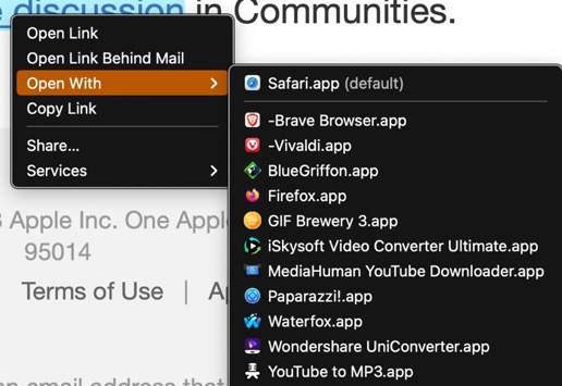 The default browser works for links within Emails, however it doesn't work from desktop URL shortcut (.webloc) files.