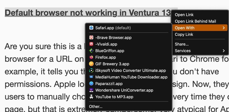 System Settings > Desktop & Dock shows my Default Browser as Google Chrome. When I click on a link, a pop-up shows me that Safari is my Default Web Browser and it opens the link in Safari. How do I make Chrome my default browser?