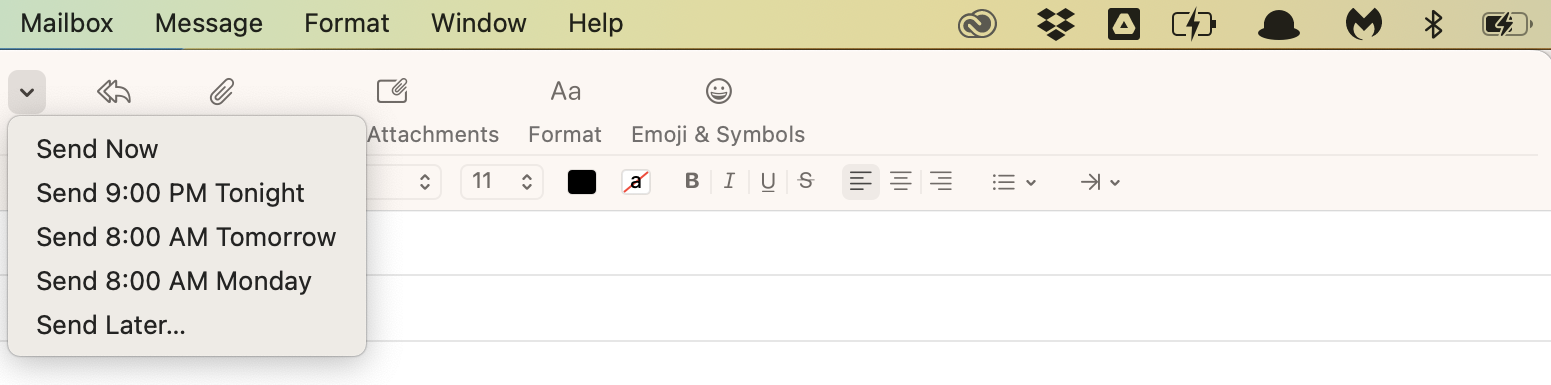 Hello all. Running Mail v16.0 in Ventura 13.0.1. Is it possible to customize / add to the menu options in the "Send Later" dropdown? For example, our offices are closed now until January 3. Could I build a menu option of "January 3, 8:00AM" without having to manually set that "Send Later" time on each email I am teeing up? Currently, the menu options are as pictured.