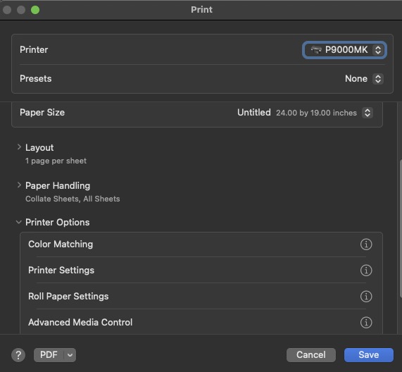 Not sure if you are aware of this but Apple OS and Epson Pro Printers drivers have a bad history of playing nice together. Created presets just do not stick consistently. And when you start to get confident that one of your presets is actually using ALL the settings you expected and print out a several hundred dollar print only to toss it in the trash, you learn not to trust them. So I, like many others, go through mental checklist each time to make sure all the settings are correct. The most important one being under the "Printer Options>Printer Settings" category in the driver. Previous Mac OS had this category located much higher up the print dialog screen so I could just click on it like muscle memory. Now it requires a scroll down every time. I know it seems like a minor issue but when you do this several hundred times a day.....it sucks.