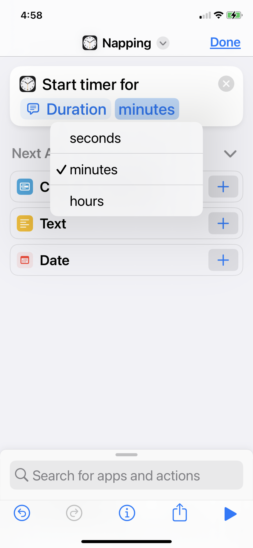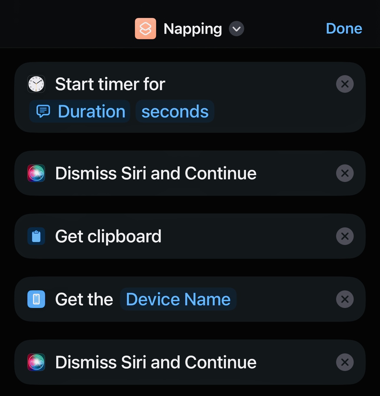 However, a custom shortcut called simply "Napping" which contains a "Start timer" action with the parameter set to "Ask Each Time" should work. The action then appears in the shortcut as: "Start timer for Duration minutes":