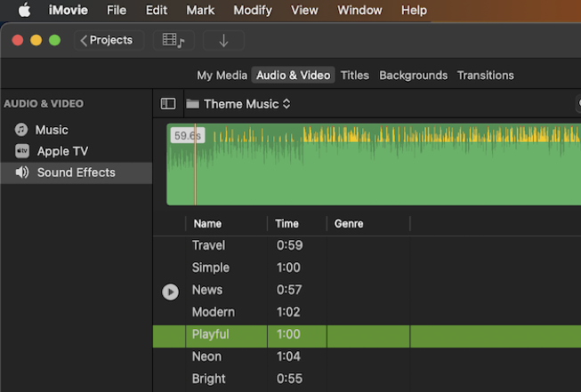 Find: iMovie Theme Music — right click on it and find and select the option to Copy "iMovie Theme Music".