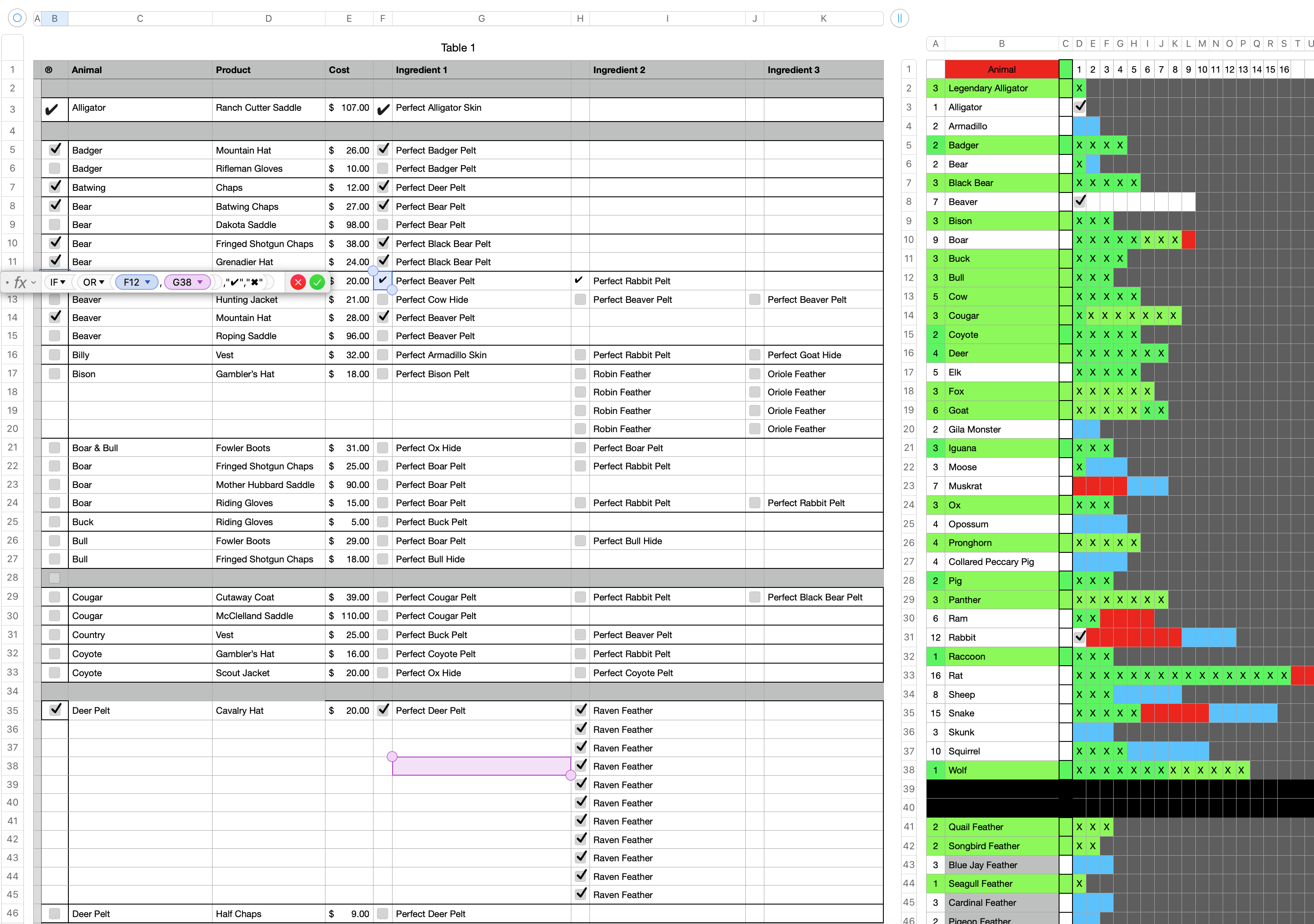Table 1 contains your inventory. Materials listed on rows with a check are in stock, and available. Those on rows with an empty checkbox are not currently available.