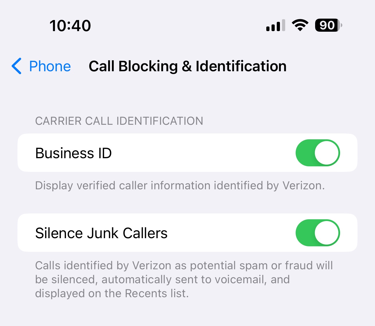 Settings, >Phone, >Call Blocking & Identification, look at Silence Junk Callers