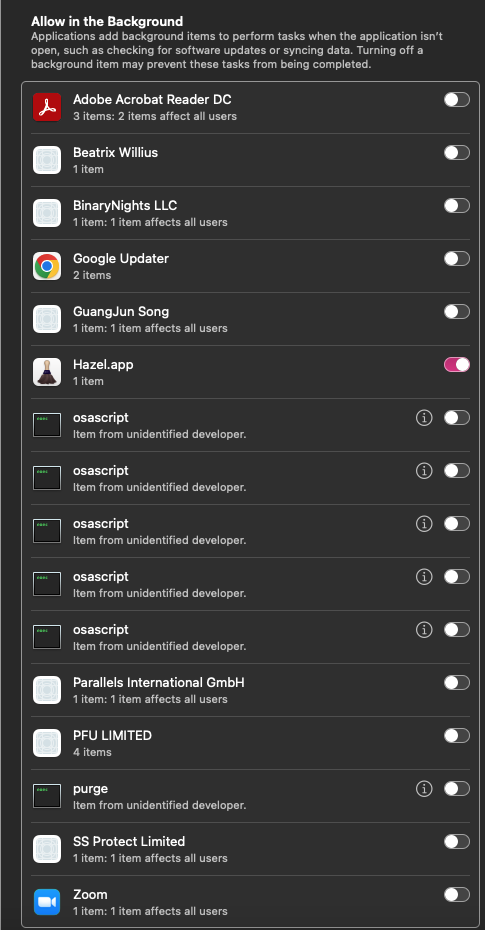 4) By far, the most interesting thing about your EtreCheck report is that this new "background items" interface in Ventura appears to be completely non-functional, at least on your computer. You have turned off everything except Hazel, but Hazel is not loaded. Many of the items that you have disabled are still loaded and/or running.