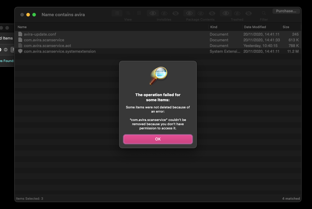 Your Avira antivirus is still partially installed. You have a System Extension from Avira antivirus installed and running. I know you mentioned that you tried to remove it, but I think the damage was done before. Did you try to manually uninstall this app? Did you use one of those vile "app zapper" tools? Or did you try to use the official uninstaller or uninstallation instructions from the developer. Unfortunately, for System Extensions, all options may be wrong. These things are just a total disaster.