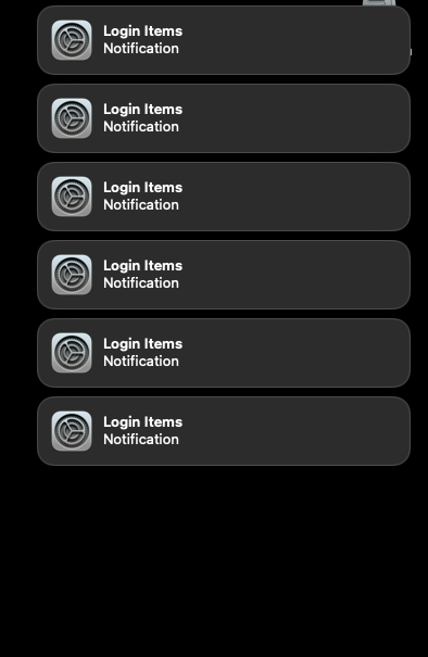 I have disabled EVERY Login Item shown in the System Settings that I can find but get a host of these notifications which appear randomly on my desktop in the R/H top corner.... Can anyone help please ?