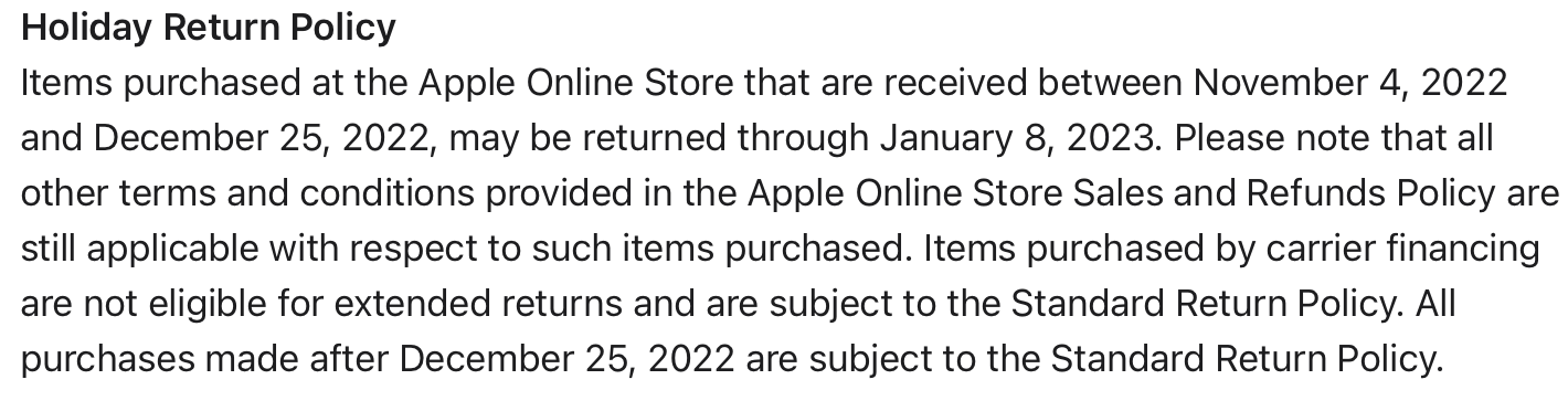 All Apple products purchased from Apple online store during the past few weeks (i.e., received no later than December 25) are eligible for return from now through January 8, 2023. Note that the standard return policy only gives you 14 days to return your Apple product.
