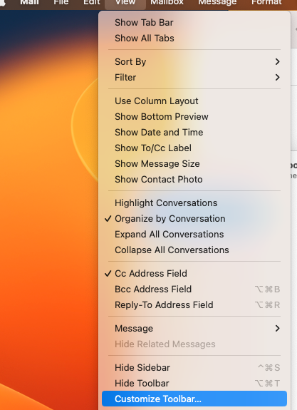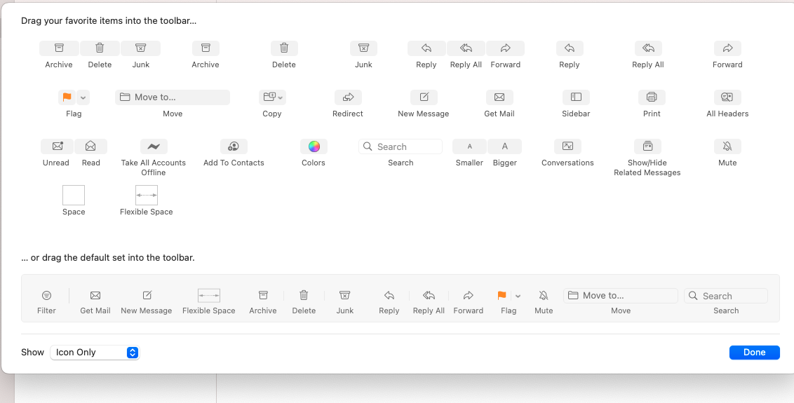 Refer to images below on Customizing the Apple Mail Tool Bar
