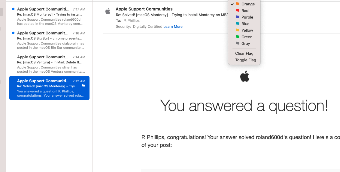 This is what appearing in my Apple Mail "Inbox " and do not see any options for " say: red flag named "urgent" and yellow flag "nearly urgent" "