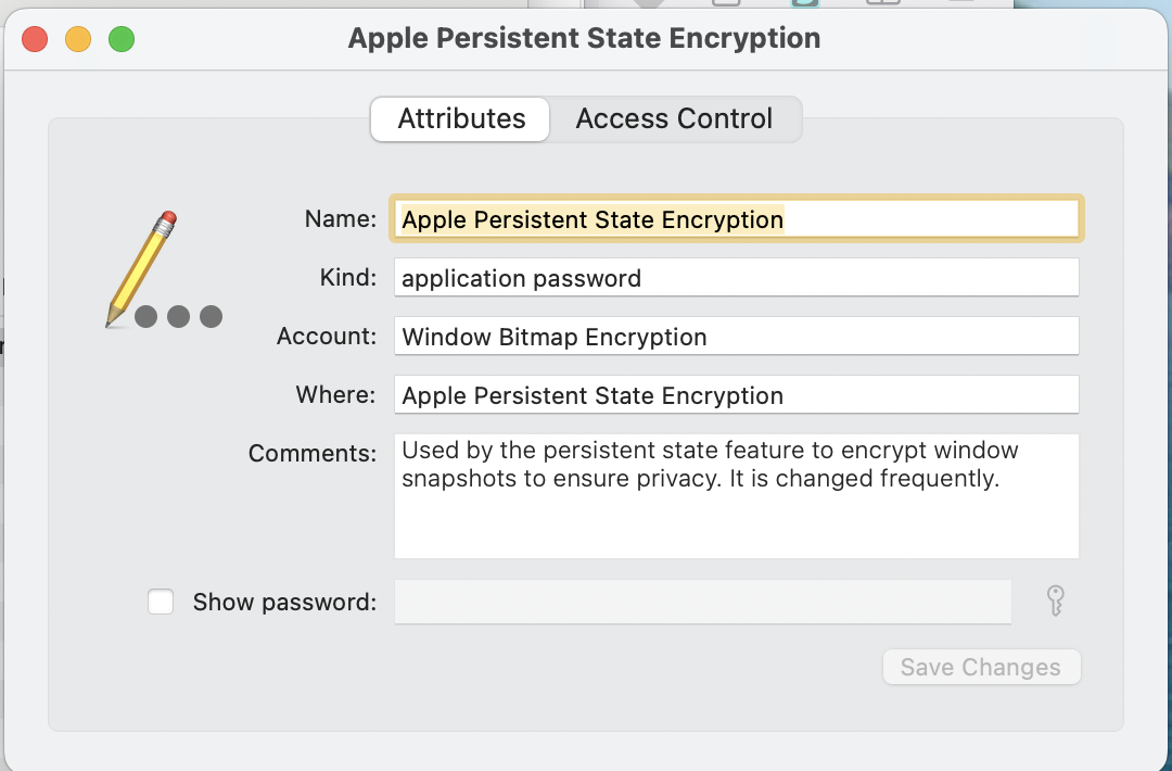 I was looking around in my Keychain Access App in the past few days and I noticed a weird phenomenon that the login item Apple Persistent State Encryption can randomly become unrestricted. Normally, every time I login to my account a new item of Apple Persistent State Encryption is created, with access set to "confirm before allowing access" and default access belongs to "talagent", and it is frequently modified (I guess it's normal system behaviour).