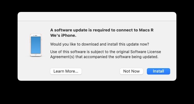 The Apple KB article says, "You might see this message if the software on your Mac needs to be updated to support the newer software on your iPhone or iPad." So it sounds as if the new software is destined to be installed on the Mac, not the iPhone, but is still failing.