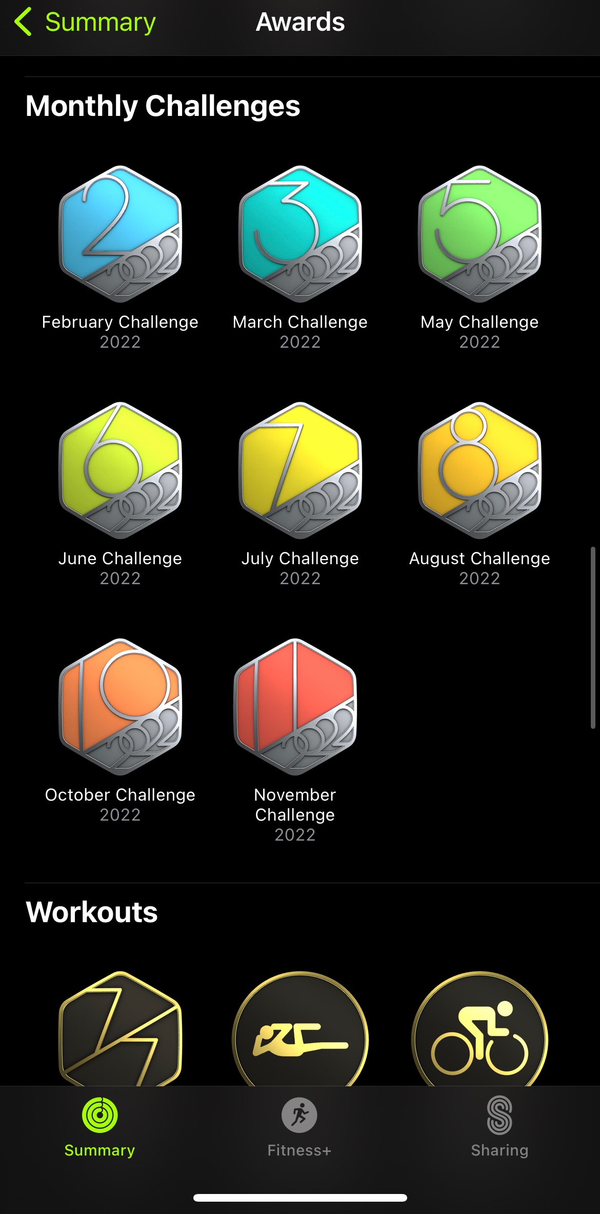 You can also open the Fitness app on your iPhone, tap the Summary tab, then swipe up to see Awards at the bottom of the screen.