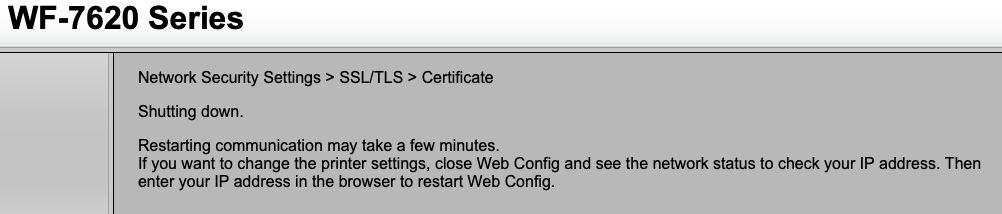 This will have you go through the generation of a new self-signed certificate for your printer's web GUI which is also what Apple uses as it goes over HTTPS when communicating with your printer. I left the "10 year" suggested value for the "Certificate Validity (year)" field, this way I don't run into this problem for quite a long time.
