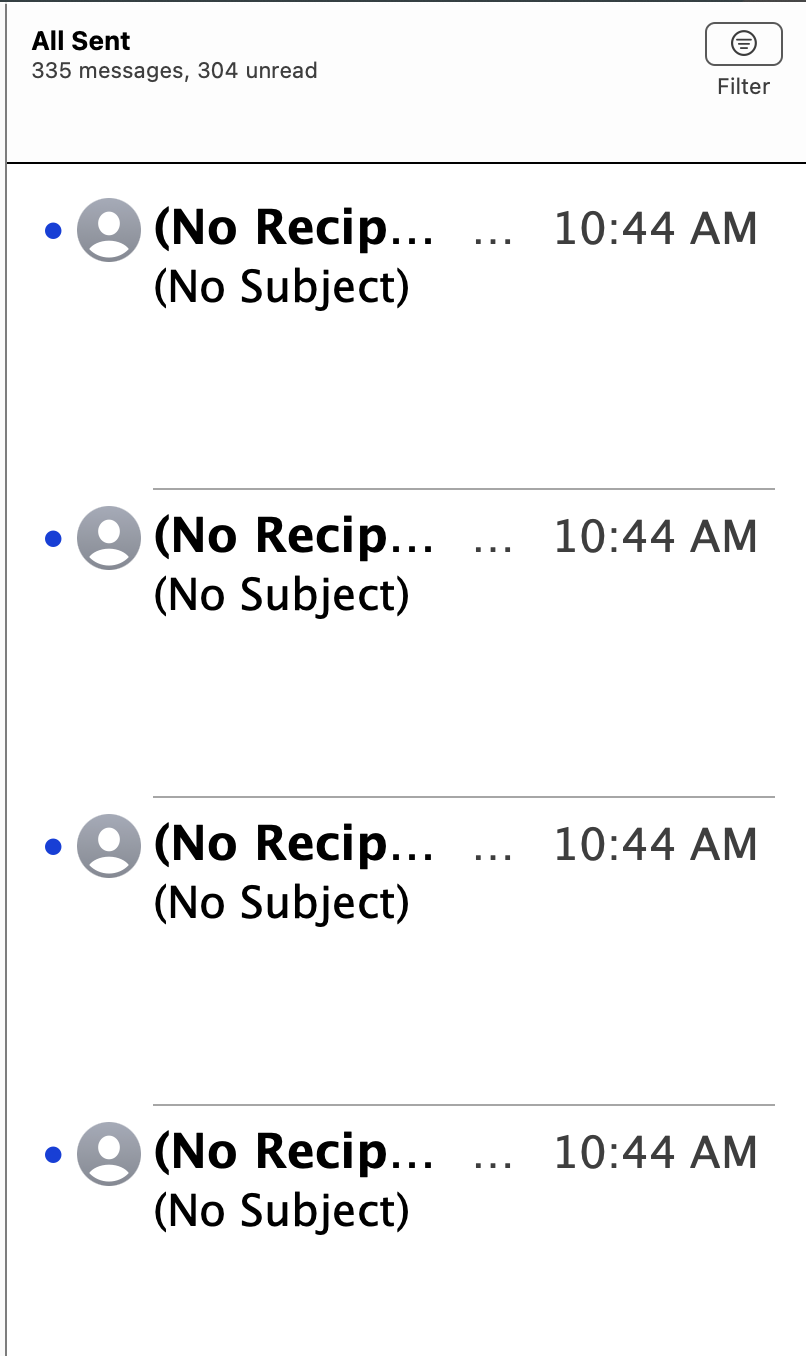 So. I open my mail and there are what appears to be " Marked Unread with similar time stamp emails" in my Sent Mail. Can not open, can not highlite and If I drag the slider to the bottom my real sent email are there. I can then scroll them and go to the latest of my sent emails. The mystery looking emails all have disappeared. BUT without me doing anything further at this point they propagate themselves again but with the exact present time. Unable to open and so it continues. I have tried a lot of the usual things suggested in the forum and other places but zip results. I am hesitating going further like removal and replacement.