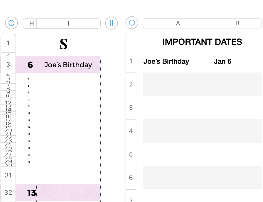 I have a calendar template in Numbers that I print at the beginning of each year. I'm looking for a way to populate important dates in the calendar based on a list of dates in a separate sheet.
