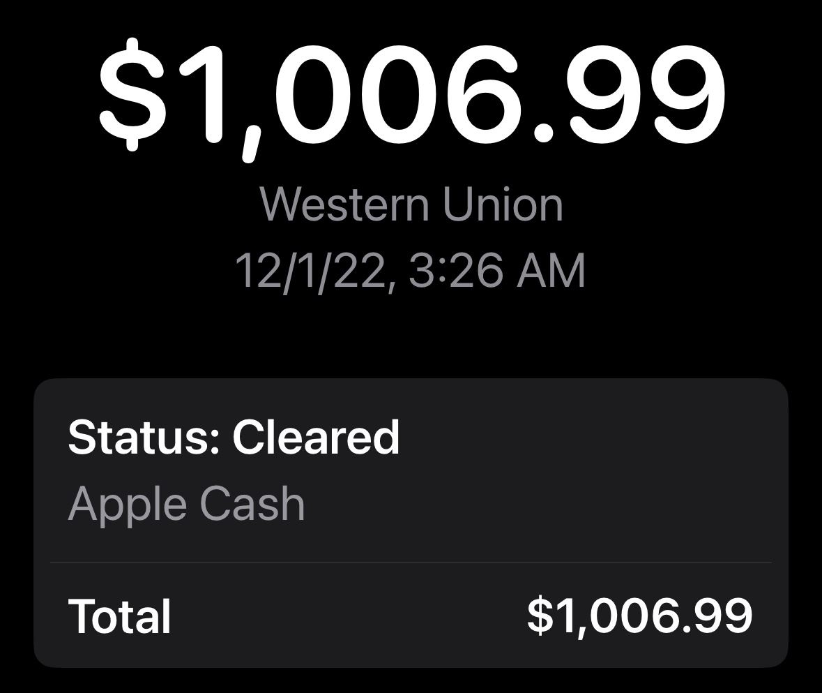 I’m traveling in south America and used apple cash to send money via western union (1,000 dicember 10th) to my friend in Brasilia. But I wrote her name wrong and Western Union refused to go through with the transaction. So I canceled the transaction as per Western Union’s instructions.