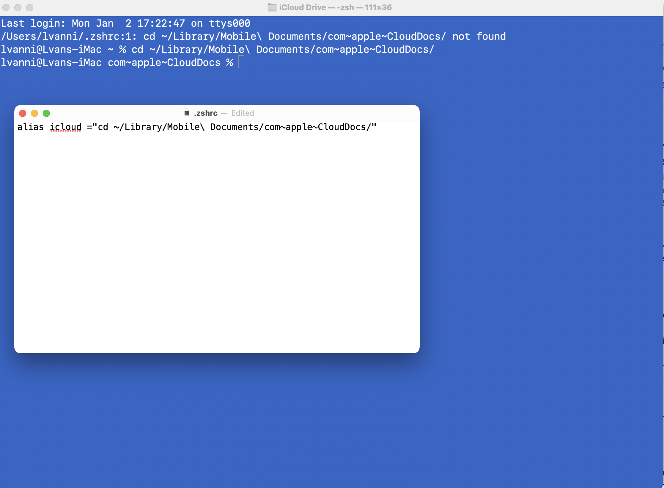 zshrc alias for iCloud path help!