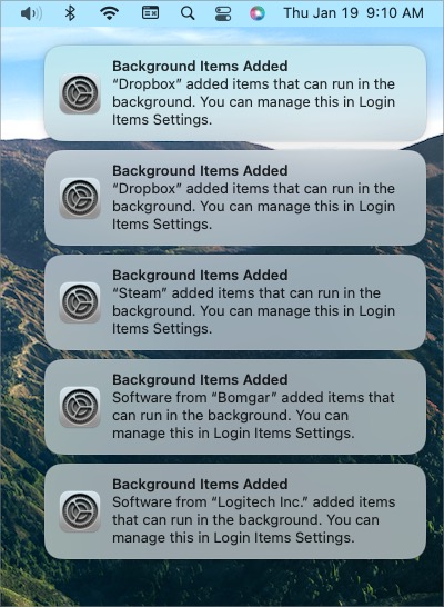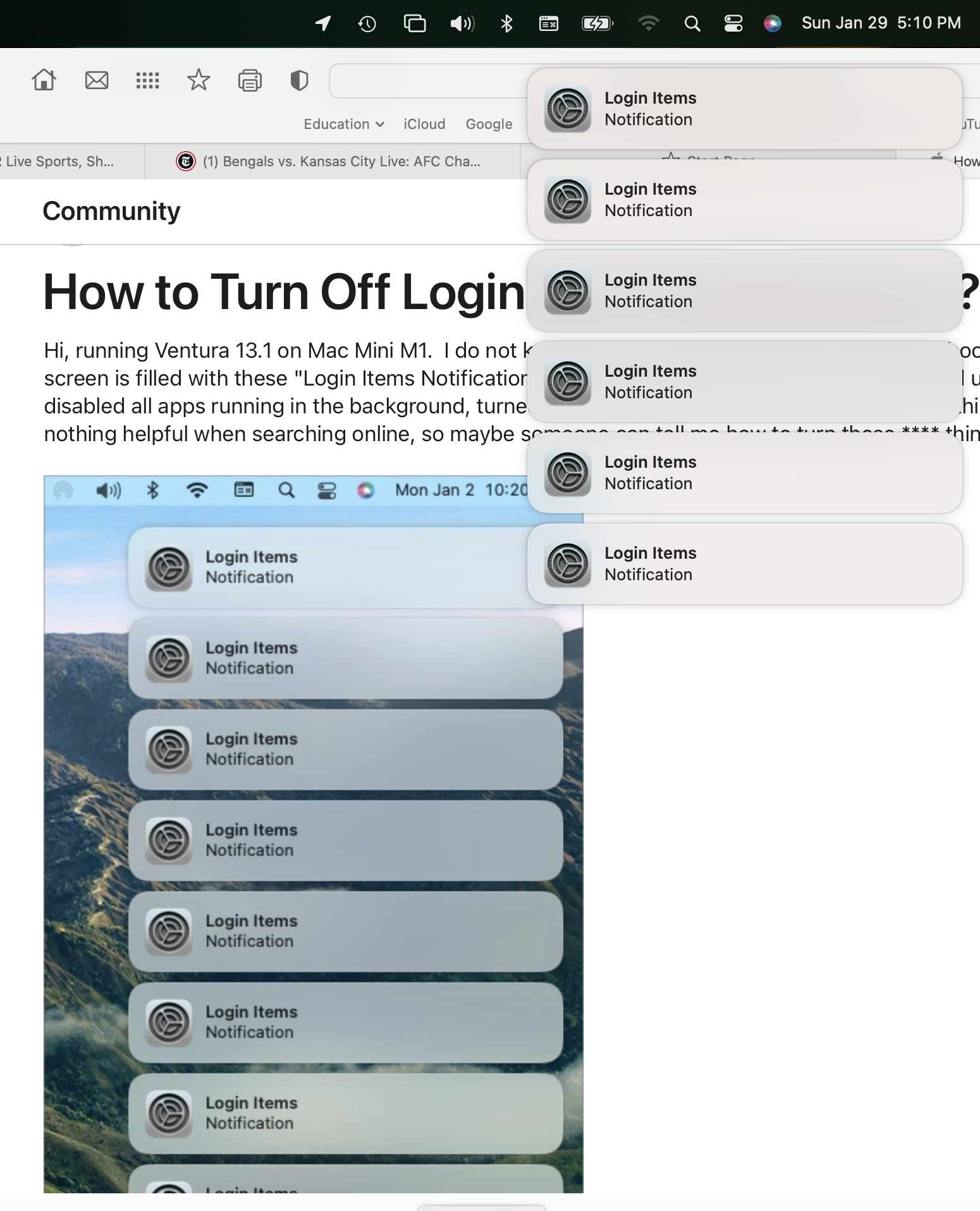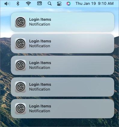 Hi, running Ventura 13.1 on Mac Mini M1. I do not know how it happened but now every time I boot up, the right side of the screen is filled with these "Login Items Notification" messages. See screenshot. I have deleted unnecessary login items, disabled all apps running in the background, turned off all notifications in System Settings. Nothing worked. And I found nothing helpful when searching online, so maybe someone can tell me how to turn these **** things off.
