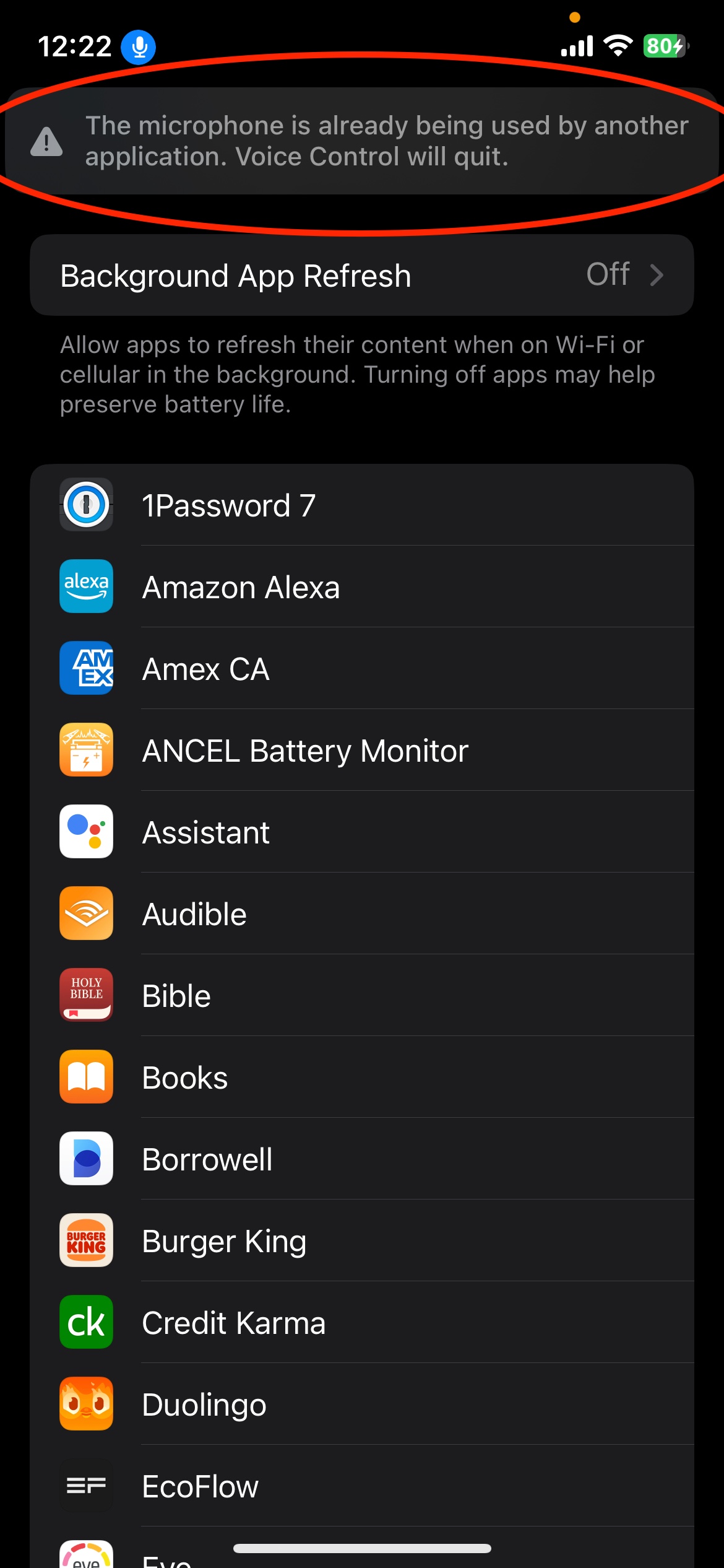 - The microphone is being used by another application. Voice Control will try again in a few moments.