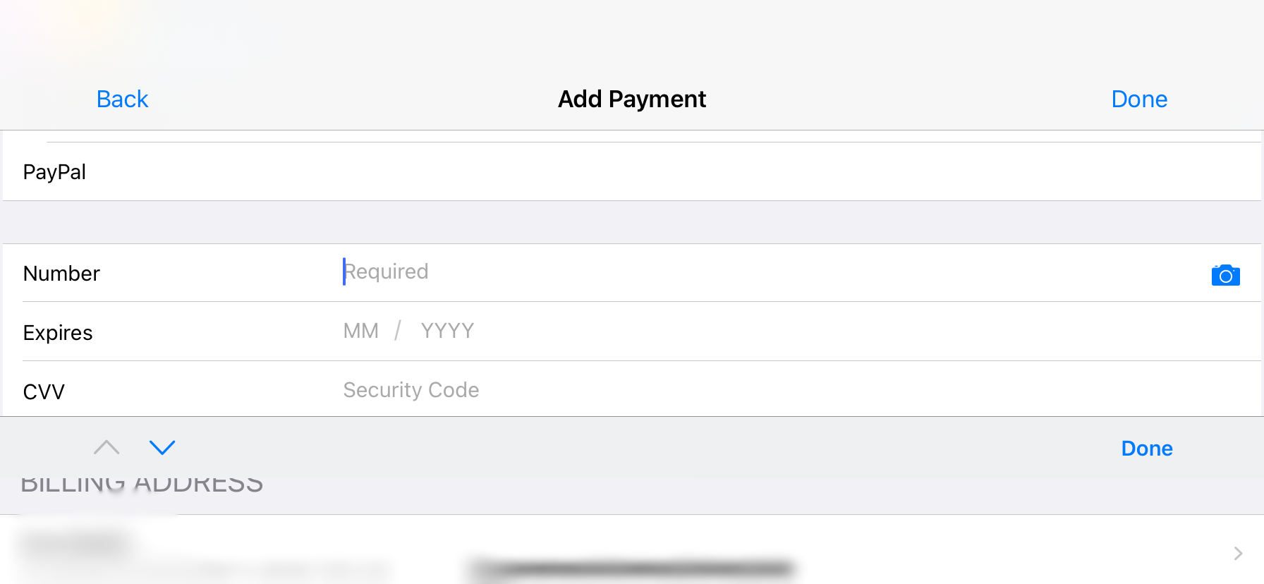 My keyboard is not showing up when I try to add my payment method. Below I attached a picture of what my screen shows when I try to add a payment method. Instead of a keyboard, it shows a line with two arrows and the word "Done" I've already tried resetting my phone and anything I could think of. Does anybody know how to fix this? Thank you.