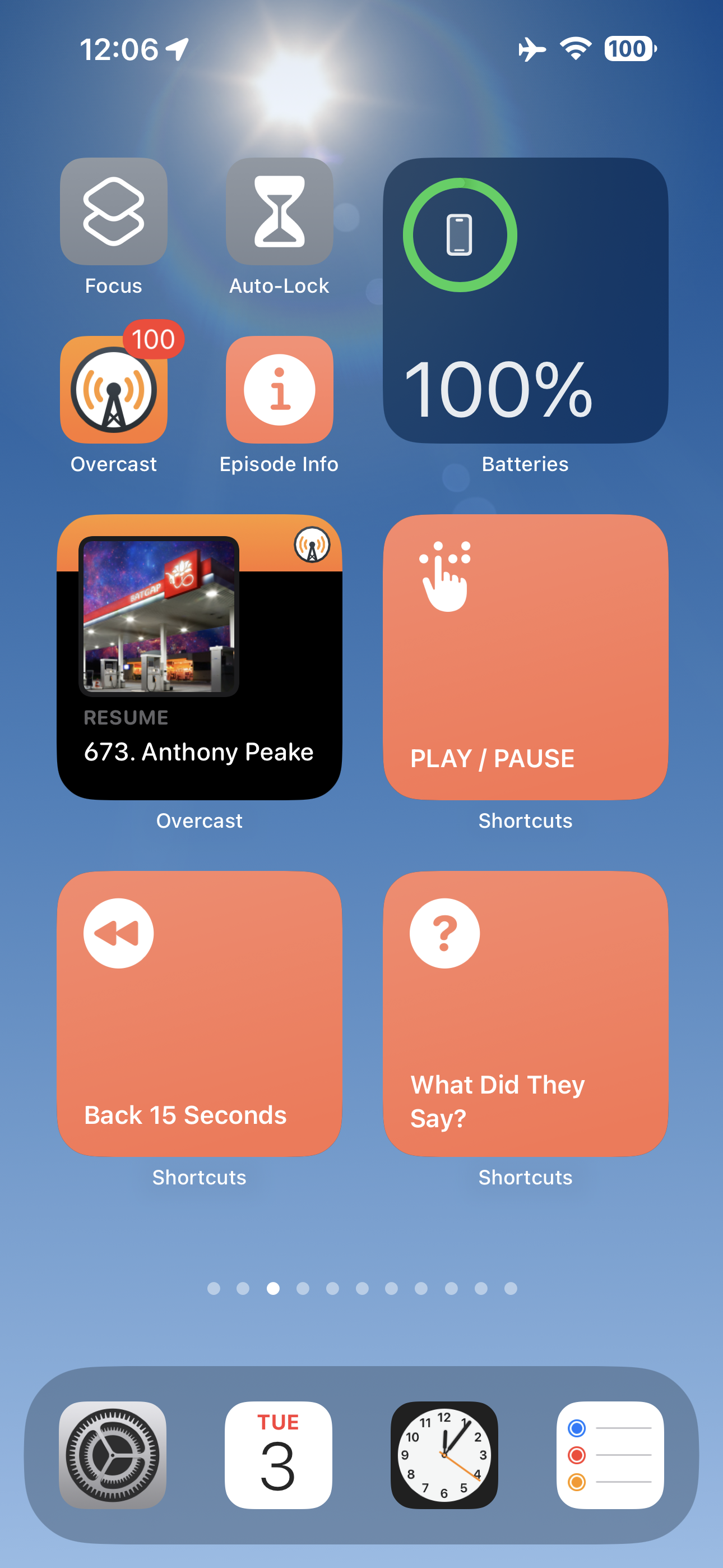 Dhjsjfejjdjehsifhsdi ~ Consider creating large, different colored Shortcuts widgets that trigger apps or menus. You can set up multiple Home Screens dedicated to different themes. Here's one of my Home Screen pages just for podcasts – and with Apple's new Live Weather wallpaper in iOS 16: